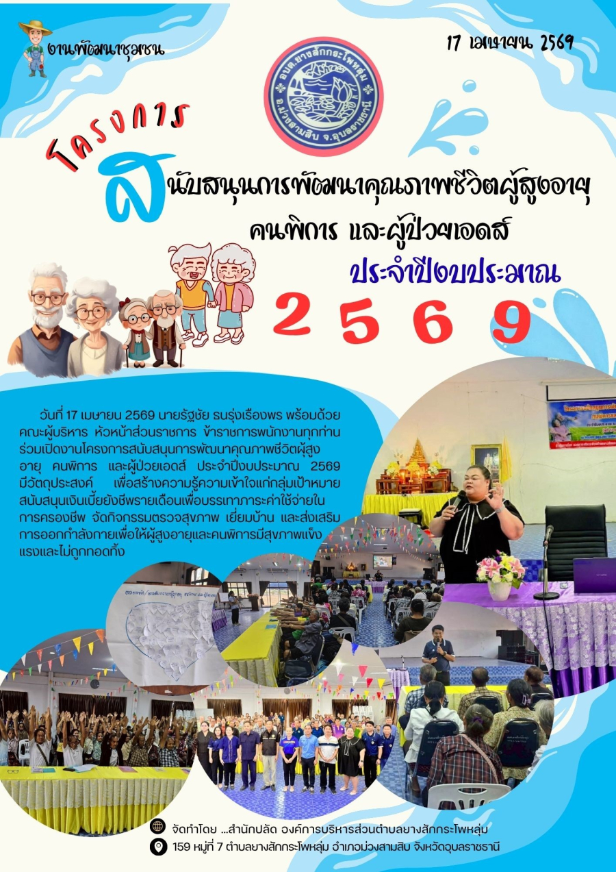 ประชาสัมพันธ์กิจกรรม : โครงการสนับสนุนการพัฒนาคุณภาพชึวิตผู้สูงอายุ คนพิการ และผู้ป่วยเอดส์ ของ อบต.ยางสักกระโพหลุ่มประจำปีงบประมาณ 2569